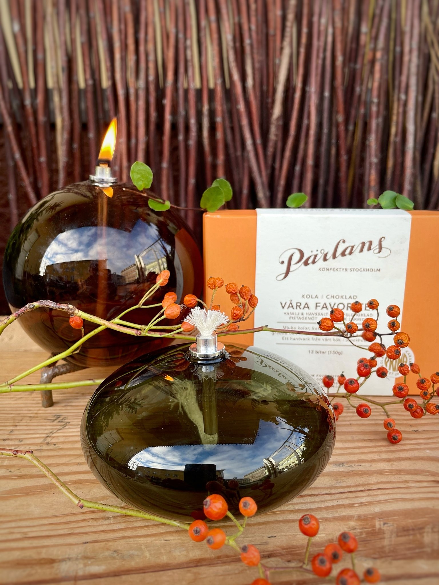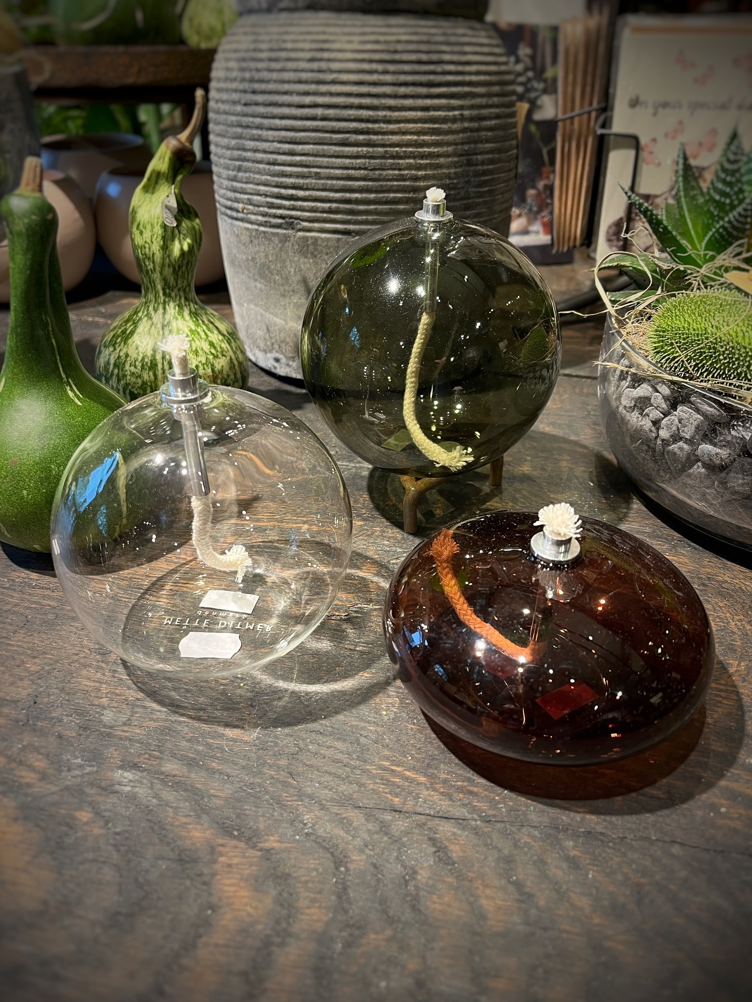 Stämningsfulla oljelampor i tre olika storlekar och färger. Medium och large är runda och small är oval.
