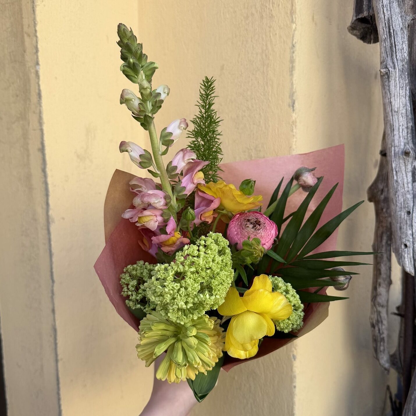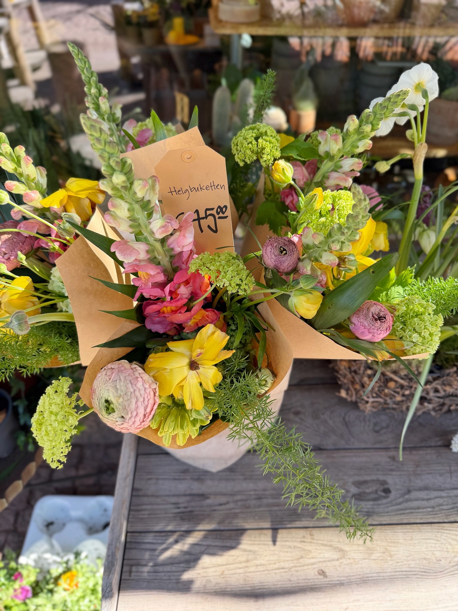 Buketten ändrar innehåll varje vecka och floristen skapar med blommor och grönt som är i säsong.