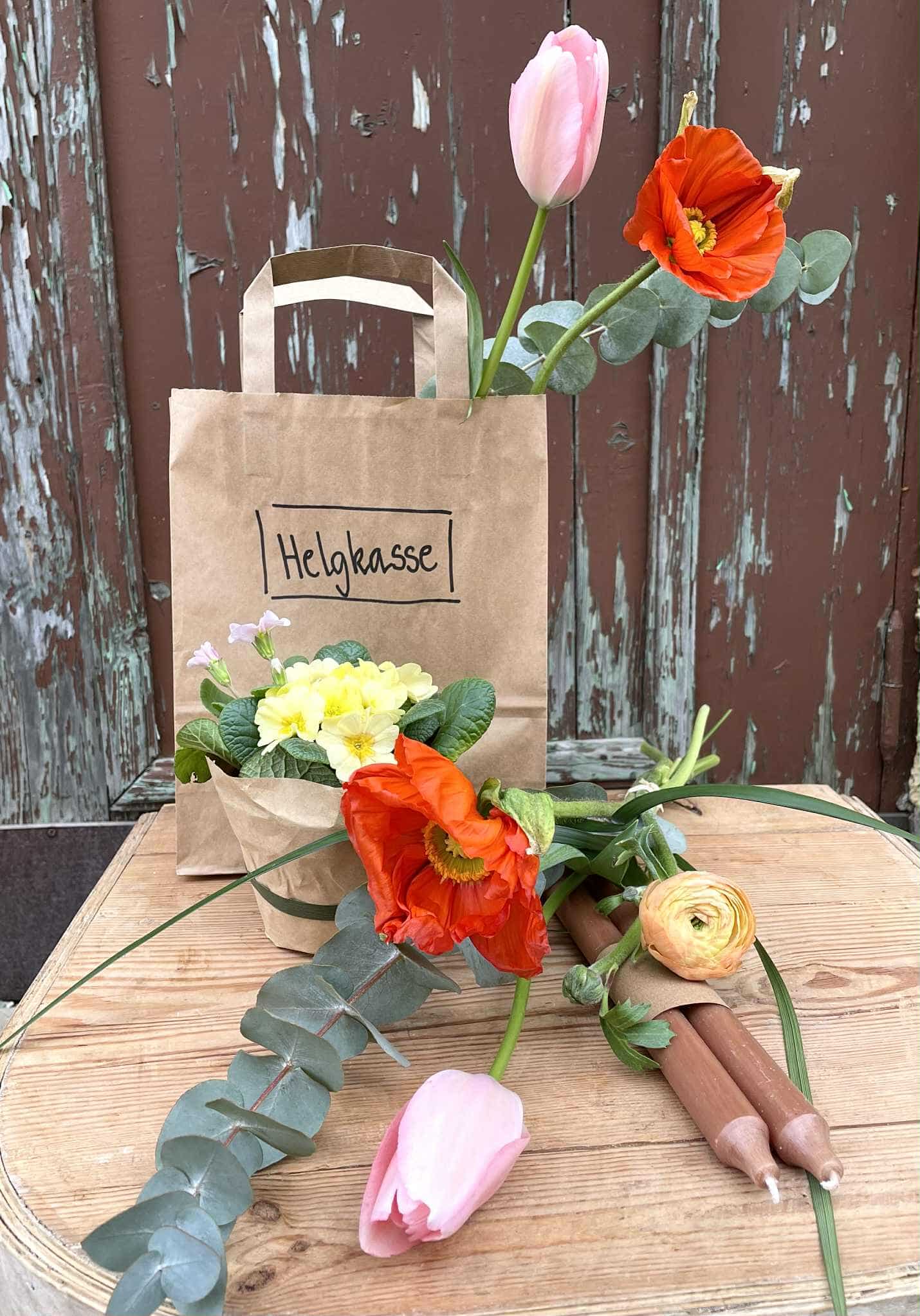 Gör helgen lite vackrare med vår färdiga helgkasse. Den innehåller den här veckan en bukett med fransk tulpan, vallmo och ranunkel, en primula i kruka och två kronljus.