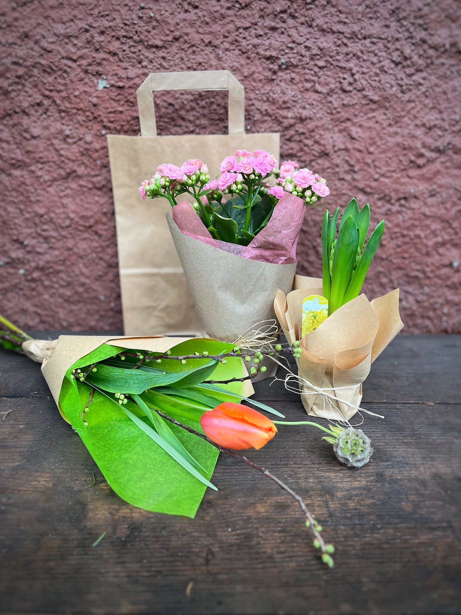 Gör helgen lite vackrare med vår färdiga helgkasse som den här veckan innehåller rosa våreld, gul hyacint och en bukett med fransk tulpan och körsbärskvistar.