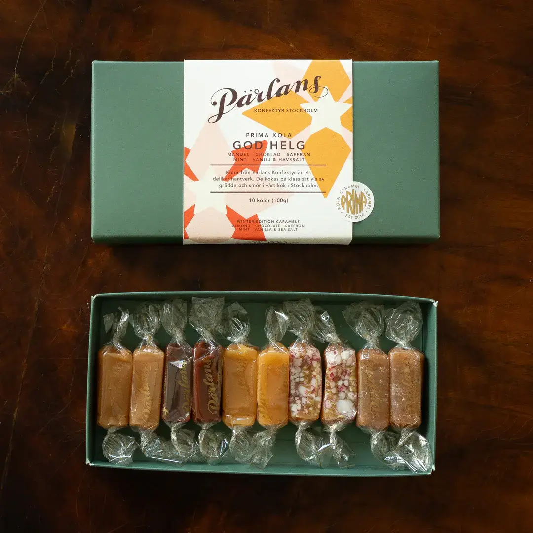 Mjuka kolor, kokade på klassiskt vis av grädde och smör. Askarna innehåller 5 olika smaker: Mandel, choklad, saffran, mint och vanilj & havssalt